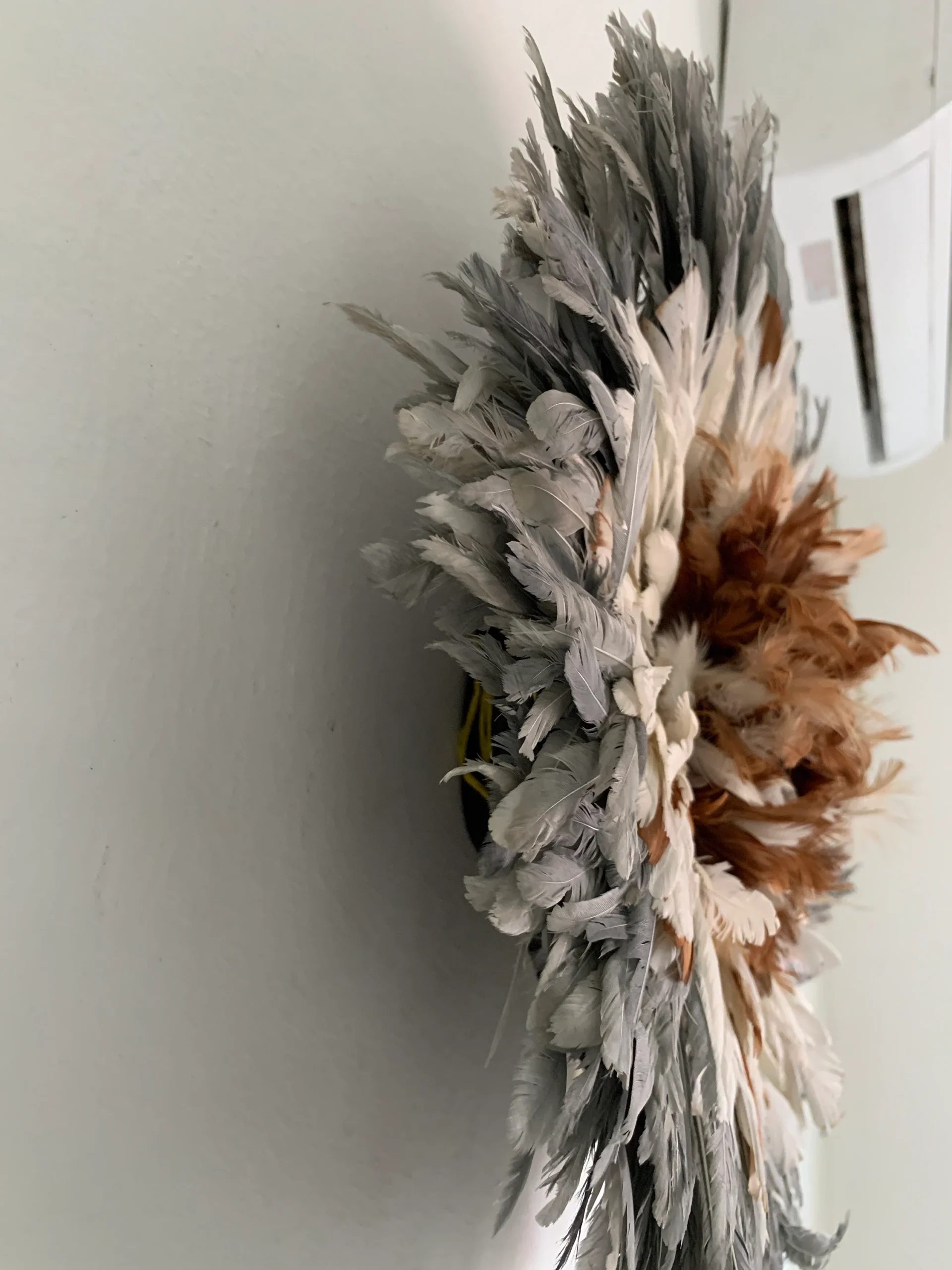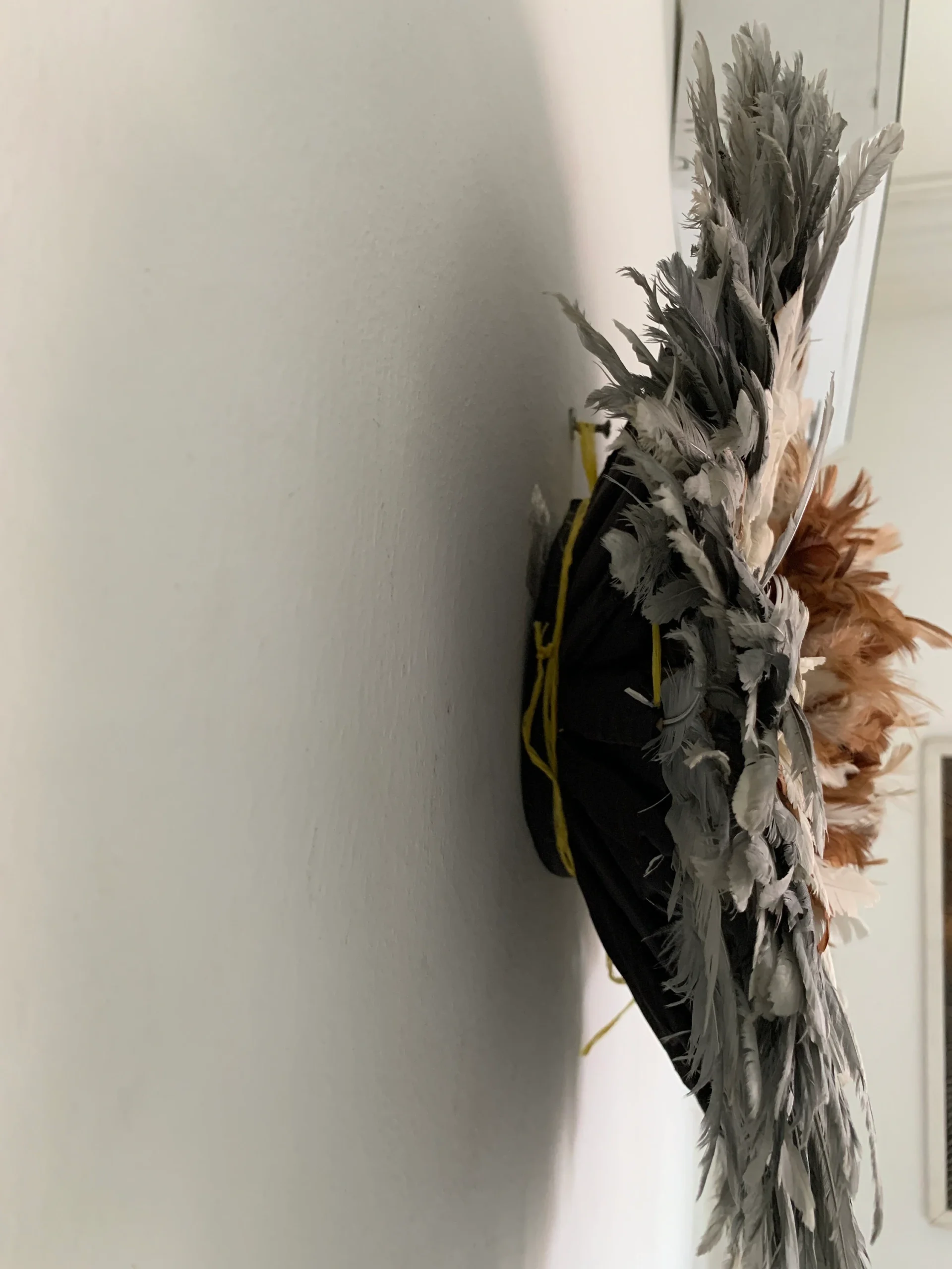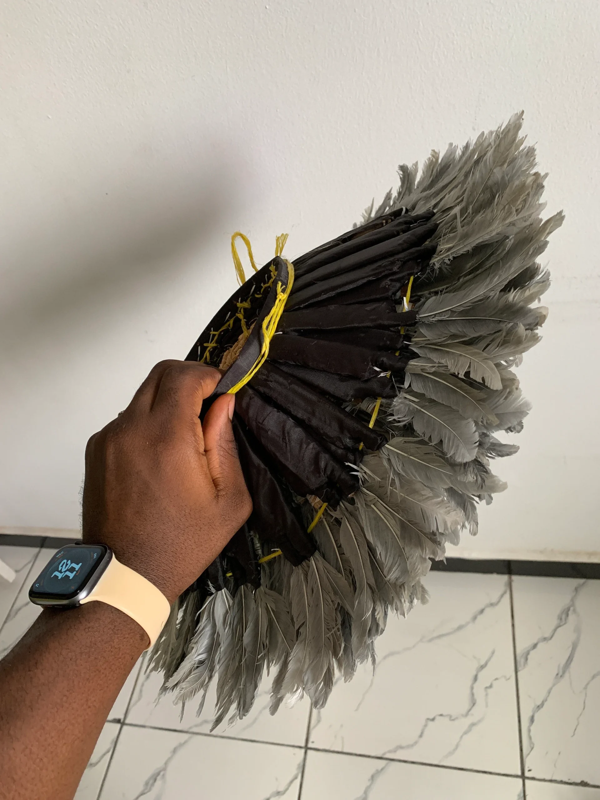The headdresses are made of natural or dyed chicken feathers as well as various wild bird feathers. The feathers are stitched onto a woven raffia support that can be folded or unfolded.