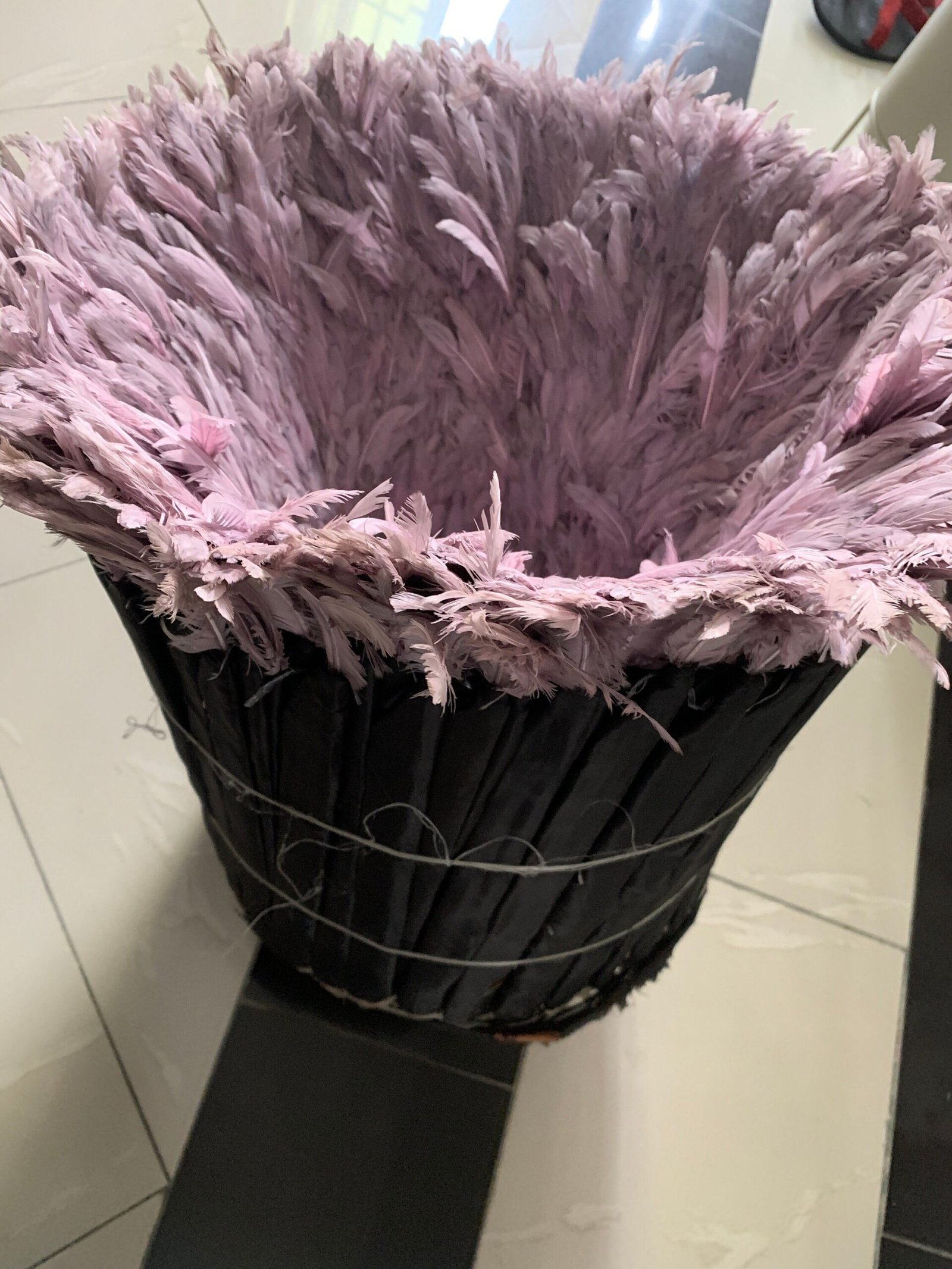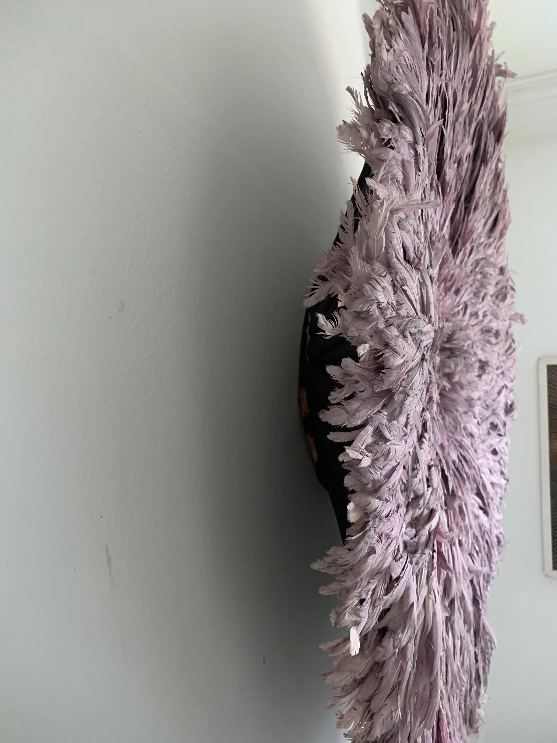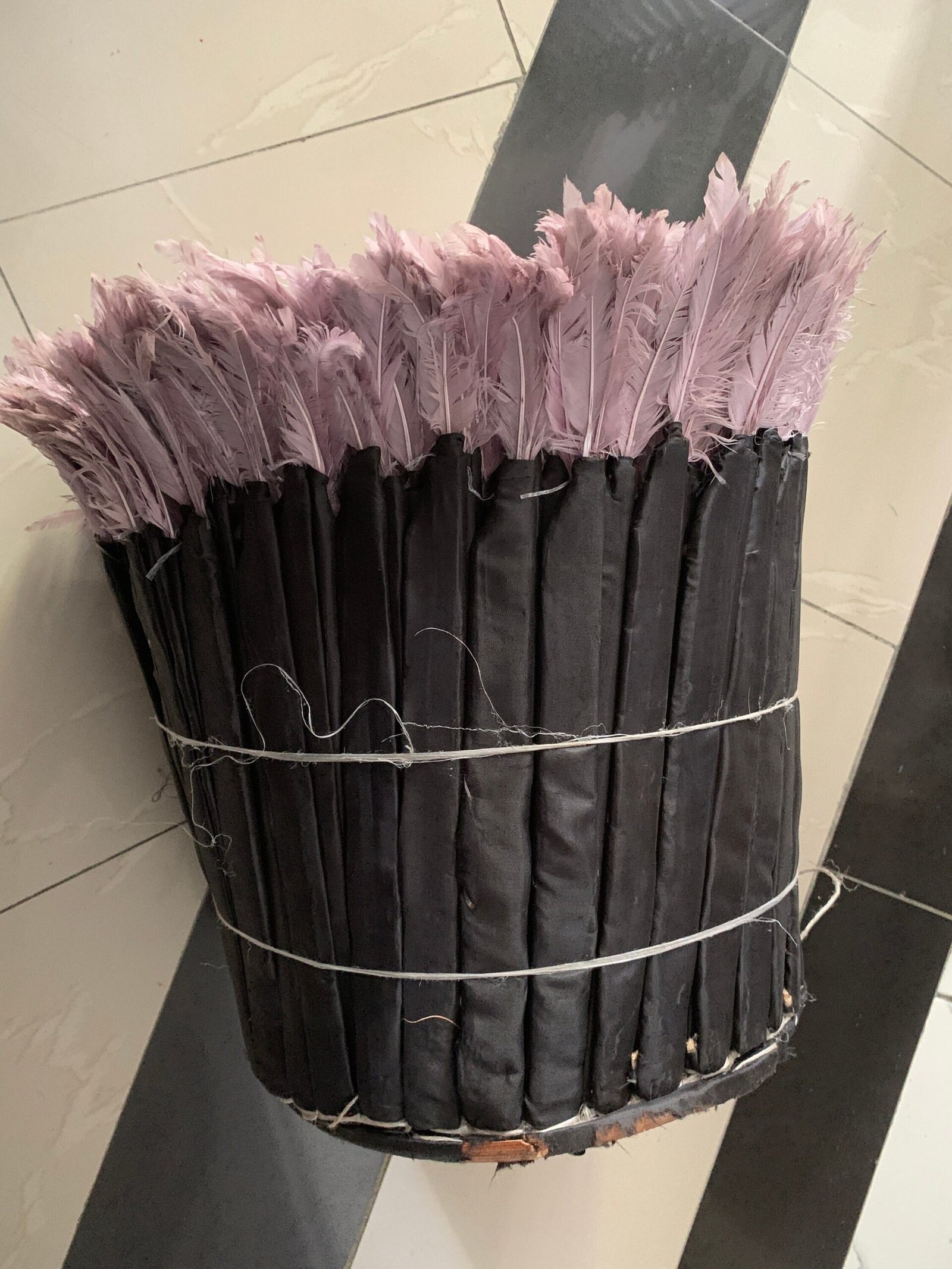 The headdresses are made of natural or dyed chicken feathers as well as various wild bird feathers. The feathers are stitched onto a woven raffia support that can be folded or unfolded.