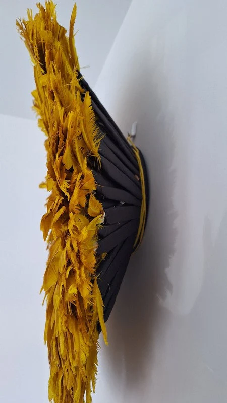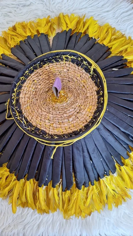The headdresses are made of natural or dyed chicken feathers as well as various wild bird feathers. The feathers are stitched onto a woven raffia support that can be folded or unfolded.