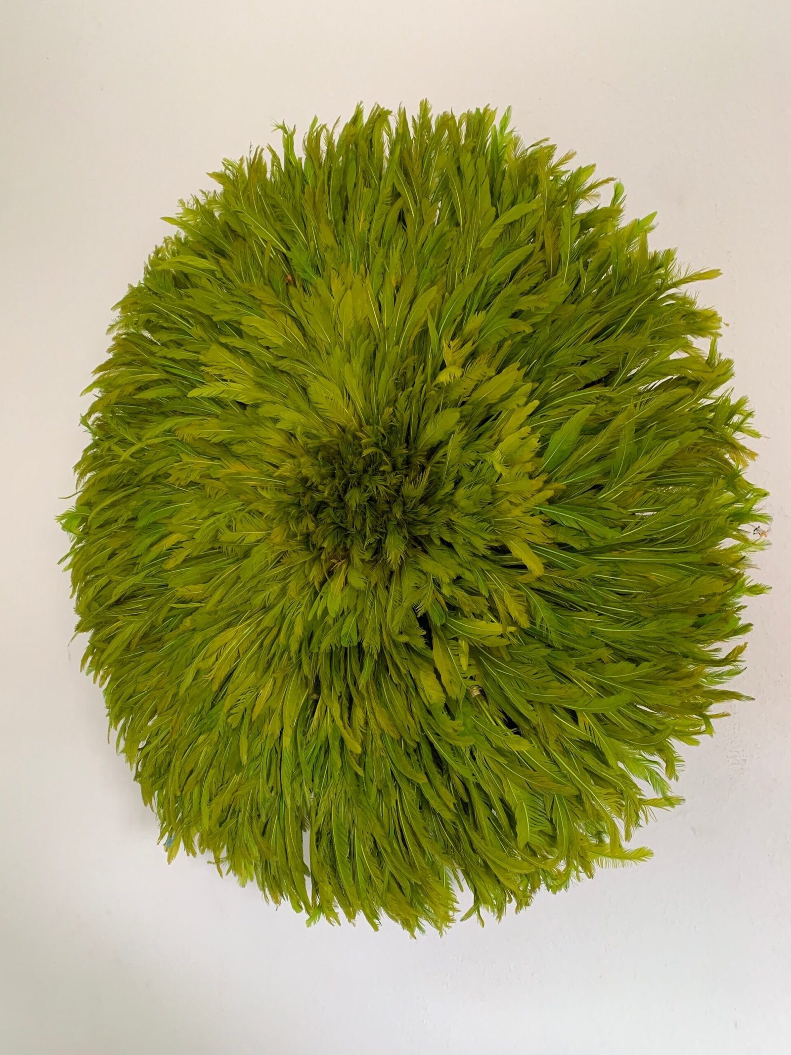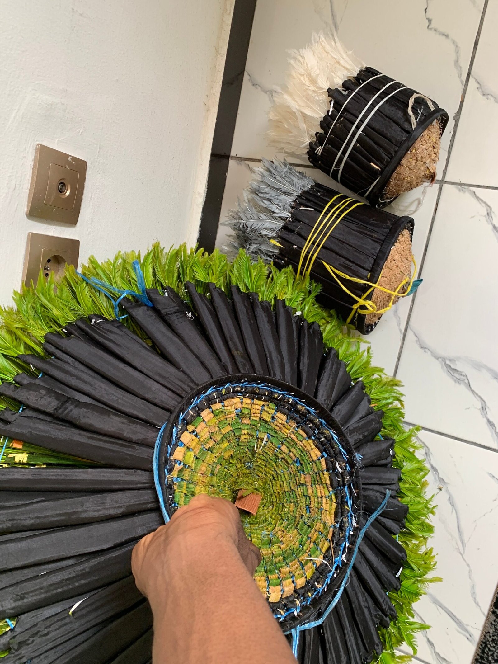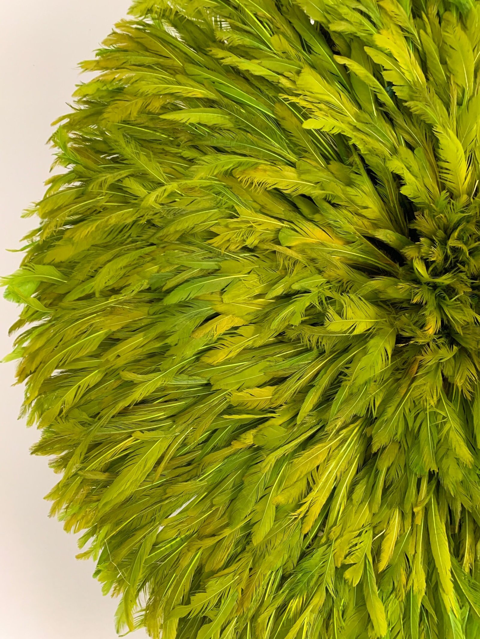 The headdresses are made of natural or dyed chicken feathers as well as various wild bird feathers. The feathers are stitched onto a woven raffia support that can be folded or unfolded.