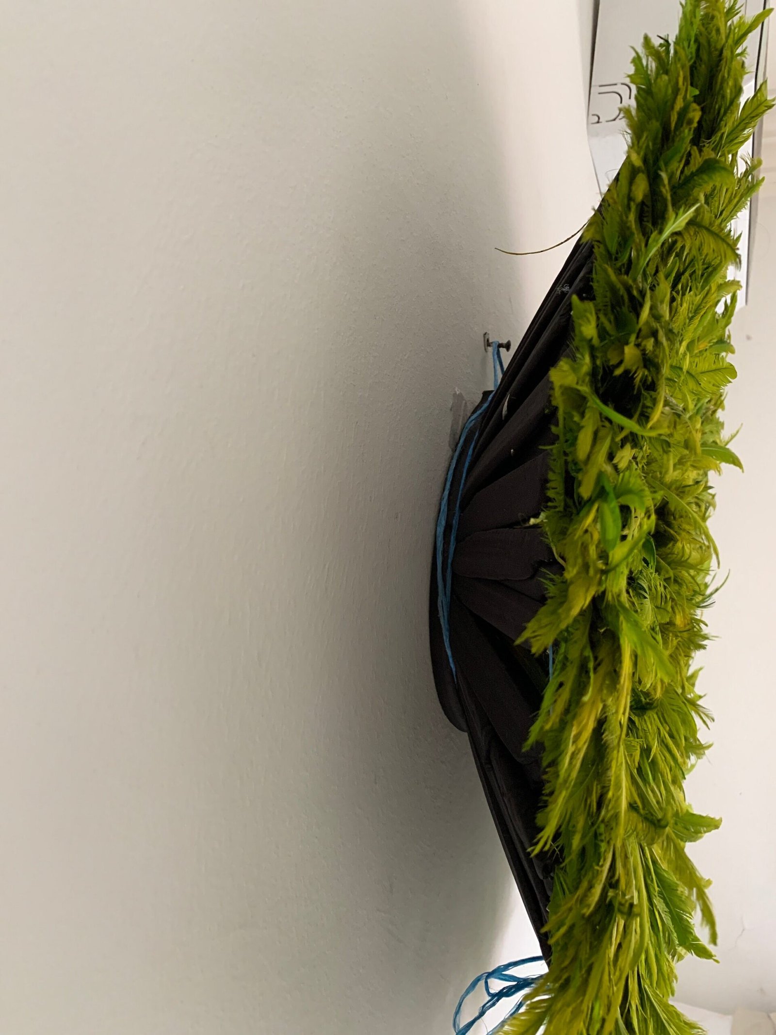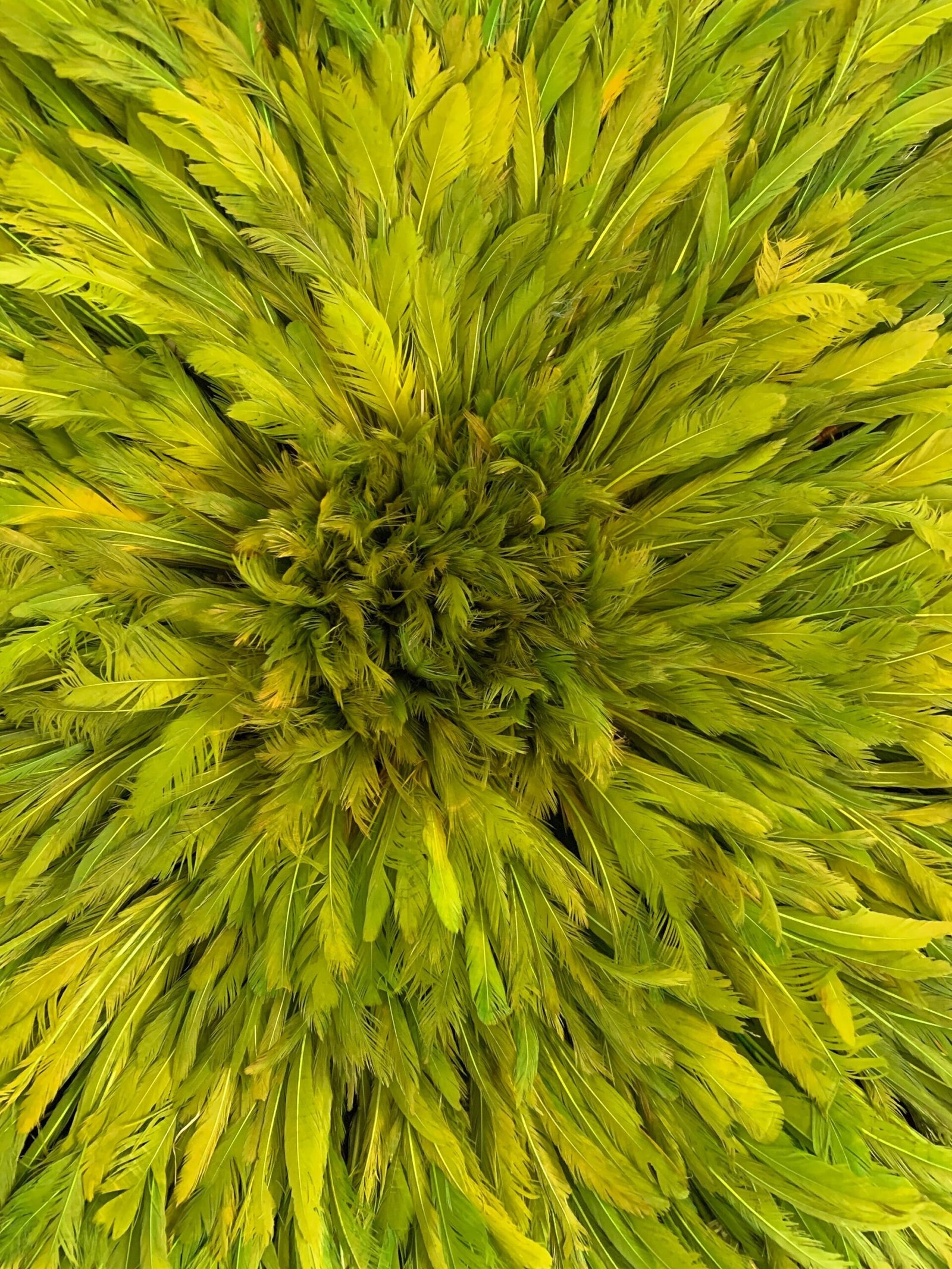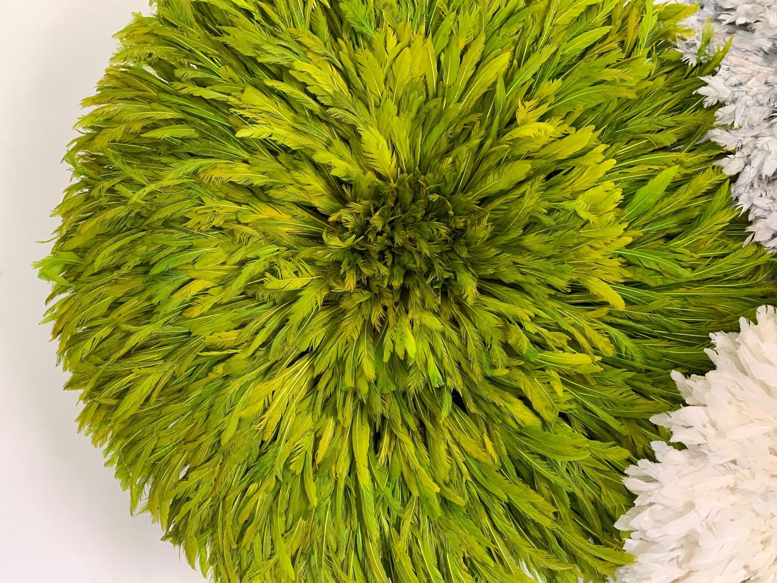 The headdresses are made of natural or dyed chicken feathers as well as various wild bird feathers. The feathers are stitched onto a woven raffia support that can be folded or unfolded.