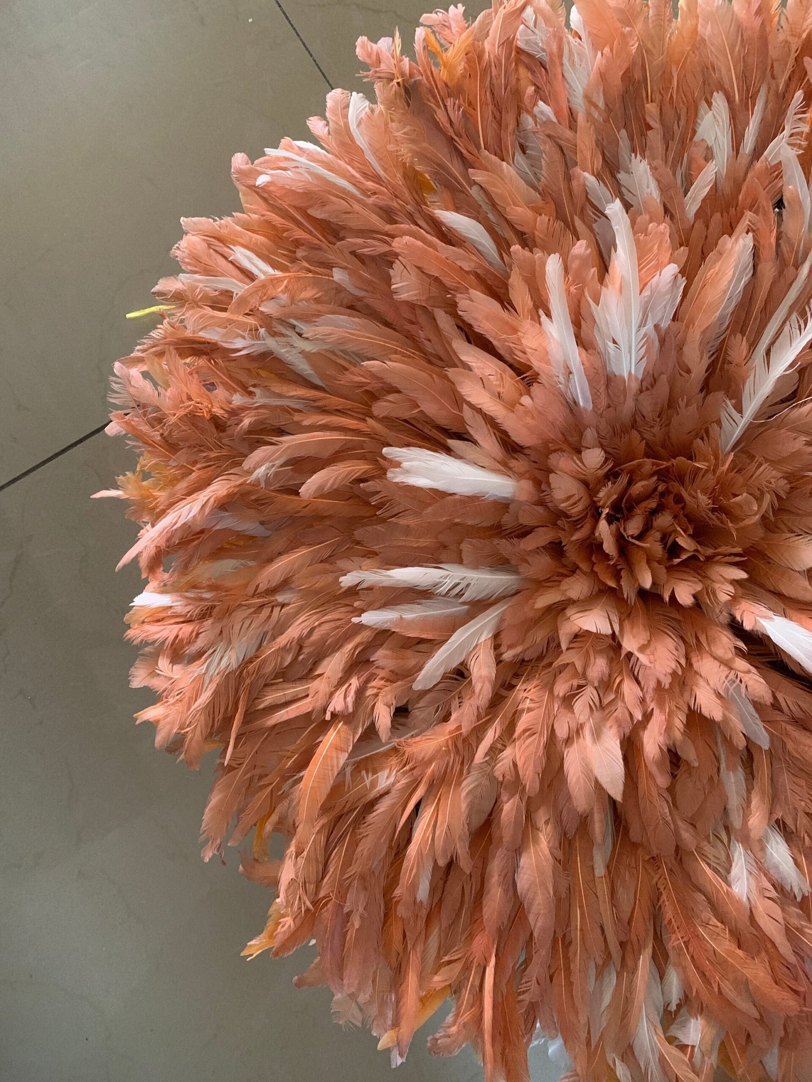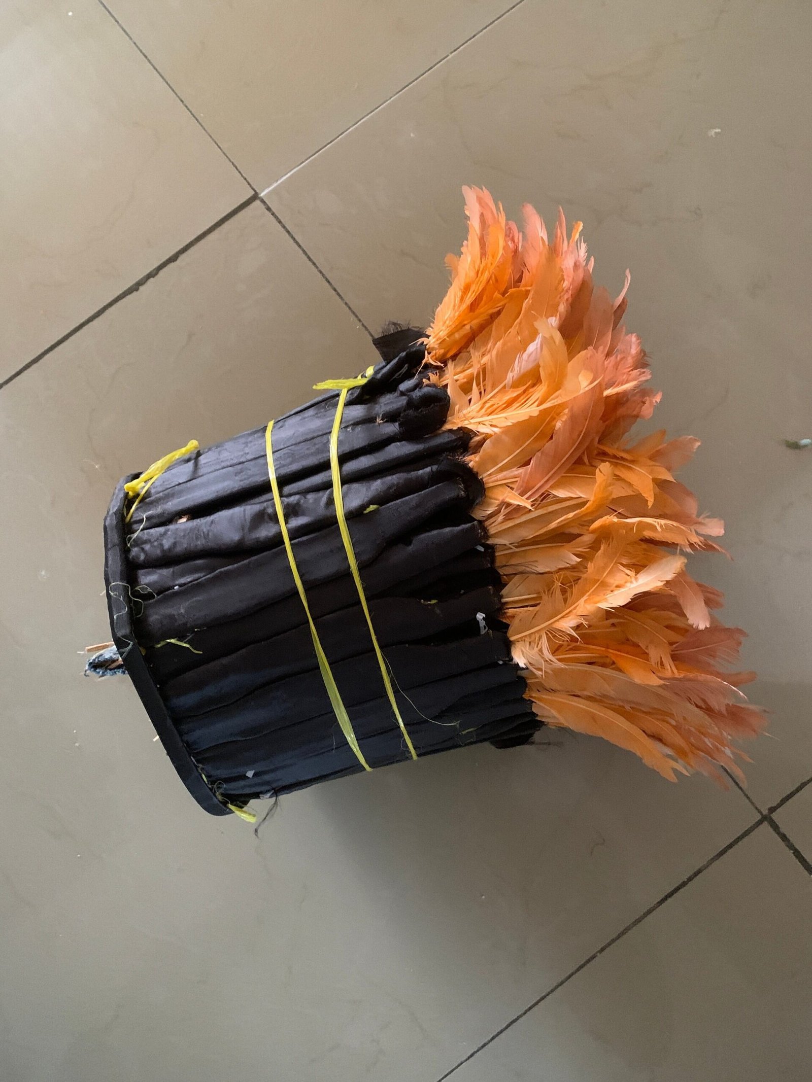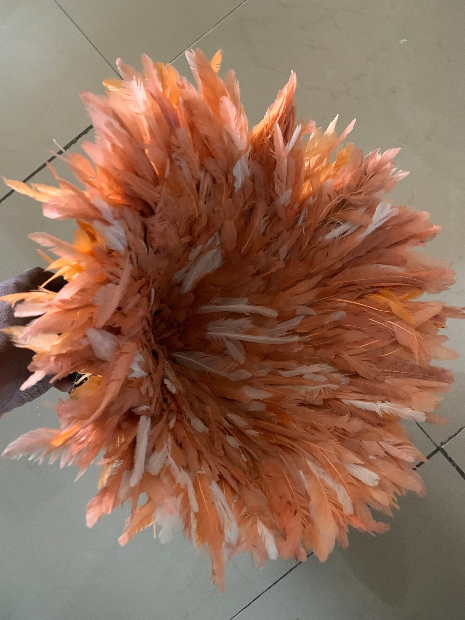 The headdresses are made of natural or dyed chicken feathers as well as various wild bird feathers. The feathers are stitched onto a woven raffia support that can be folded or unfolded.