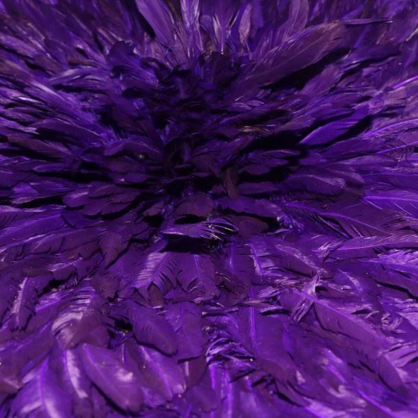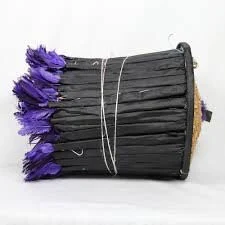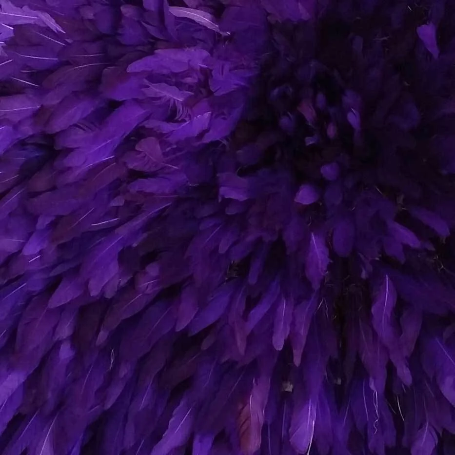 The headdresses are made of natural or dyed chicken feathers as well as various wild bird feathers. The feathers are stitched onto a woven raffia support that can be folded or unfolded.