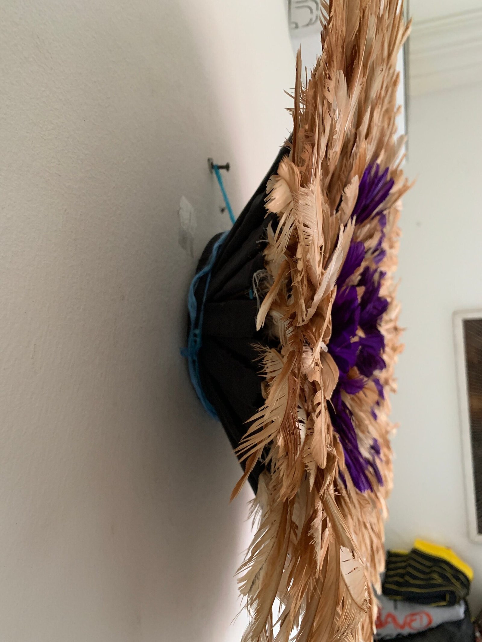 The headdresses are made of natural or dyed chicken feathers as well as various wild bird feathers. The feathers are stitched onto a woven raffia support that can be folded or unfolded.