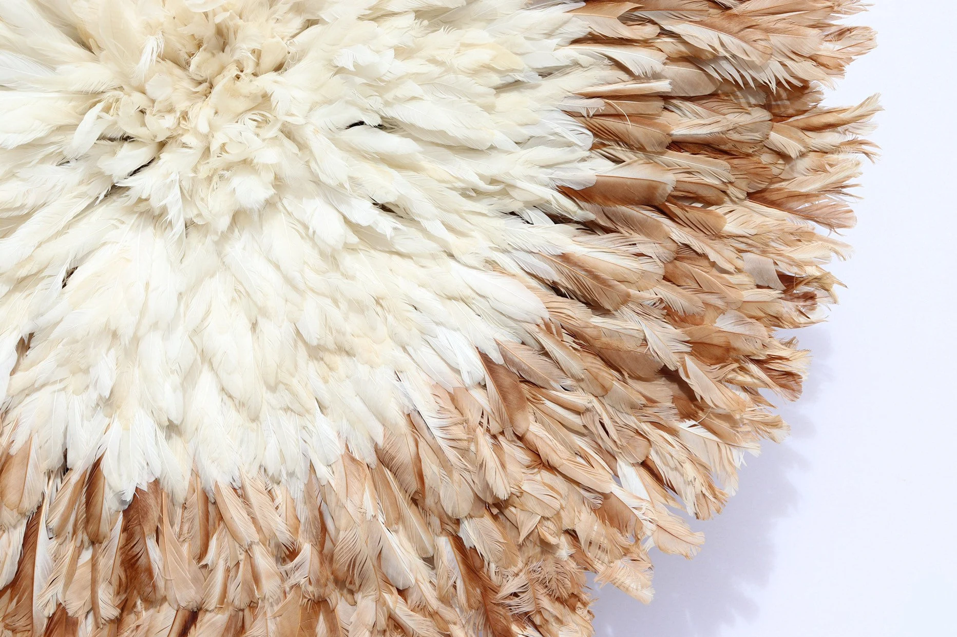 The headdresses are made of natural or dyed chicken feathers as well as various wild bird feathers. The feathers are stitched onto a woven raffia support that can be folded or unfolded.