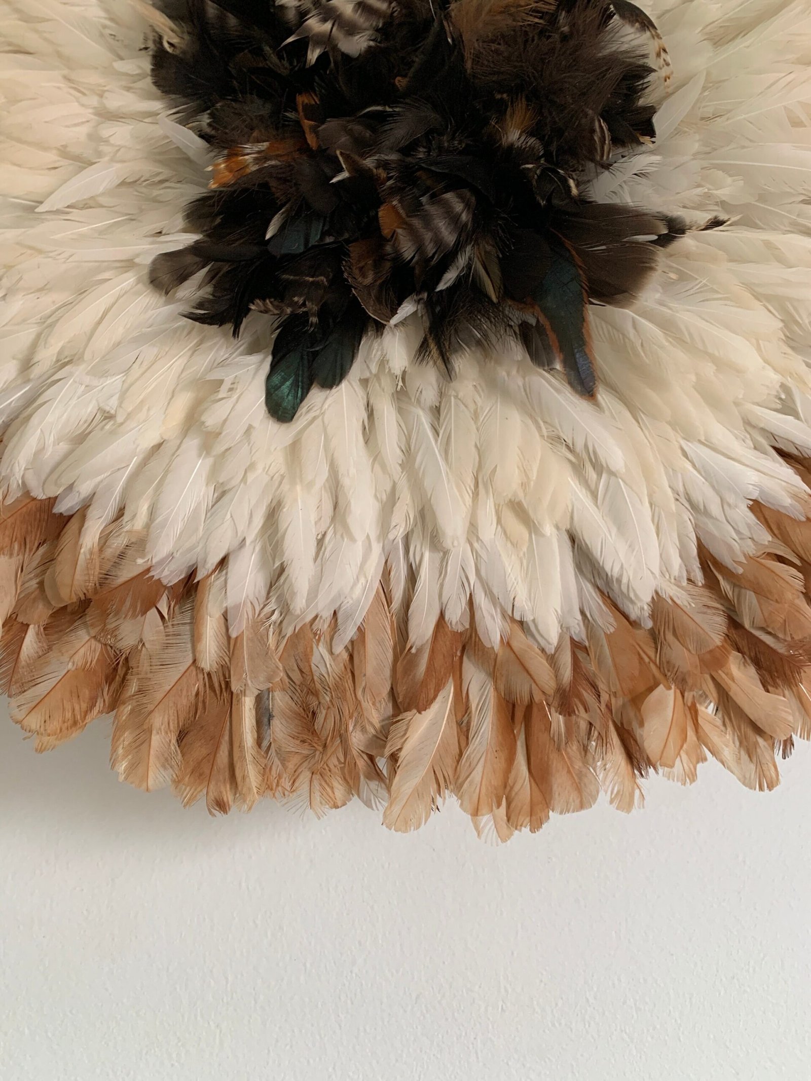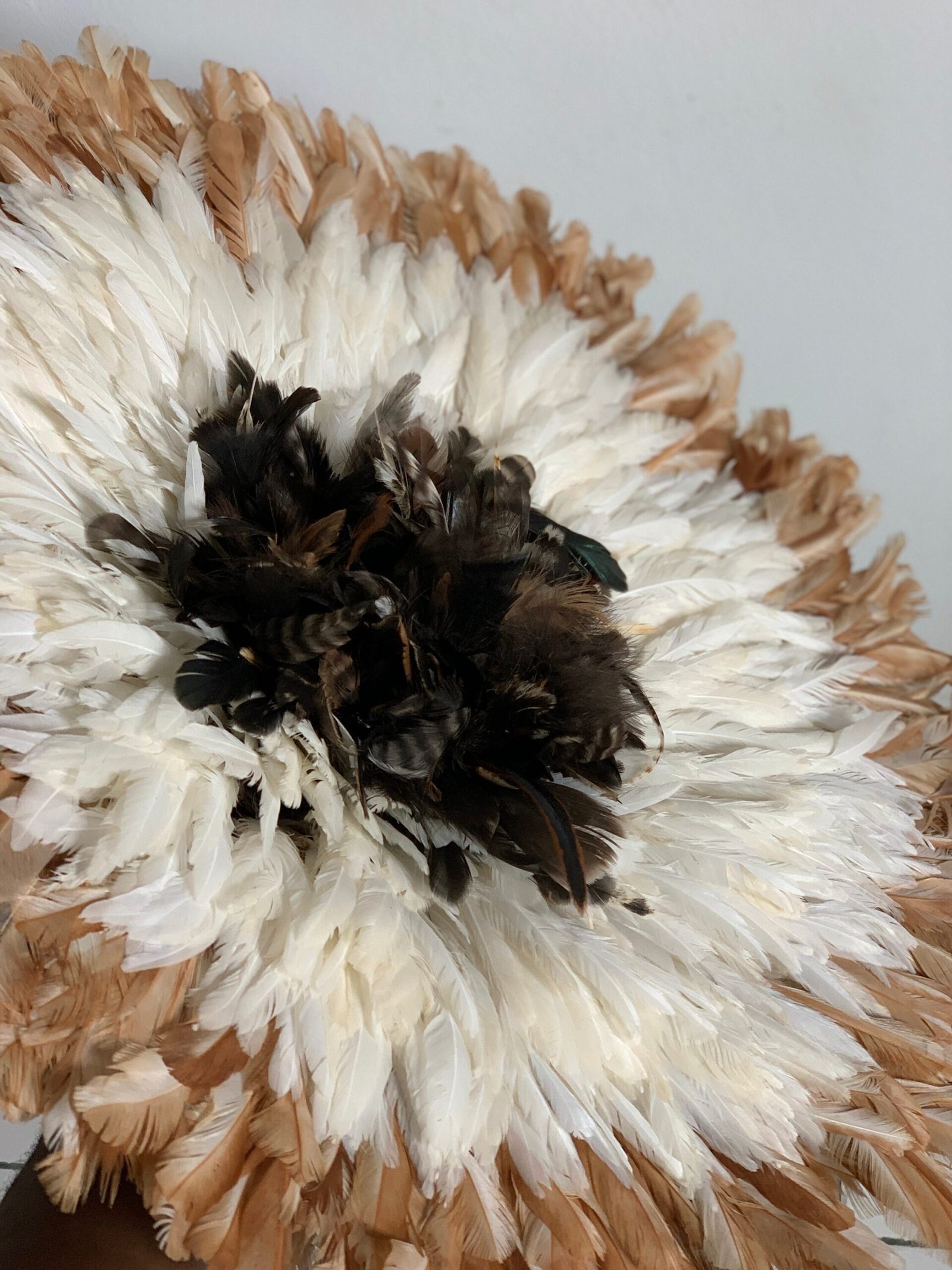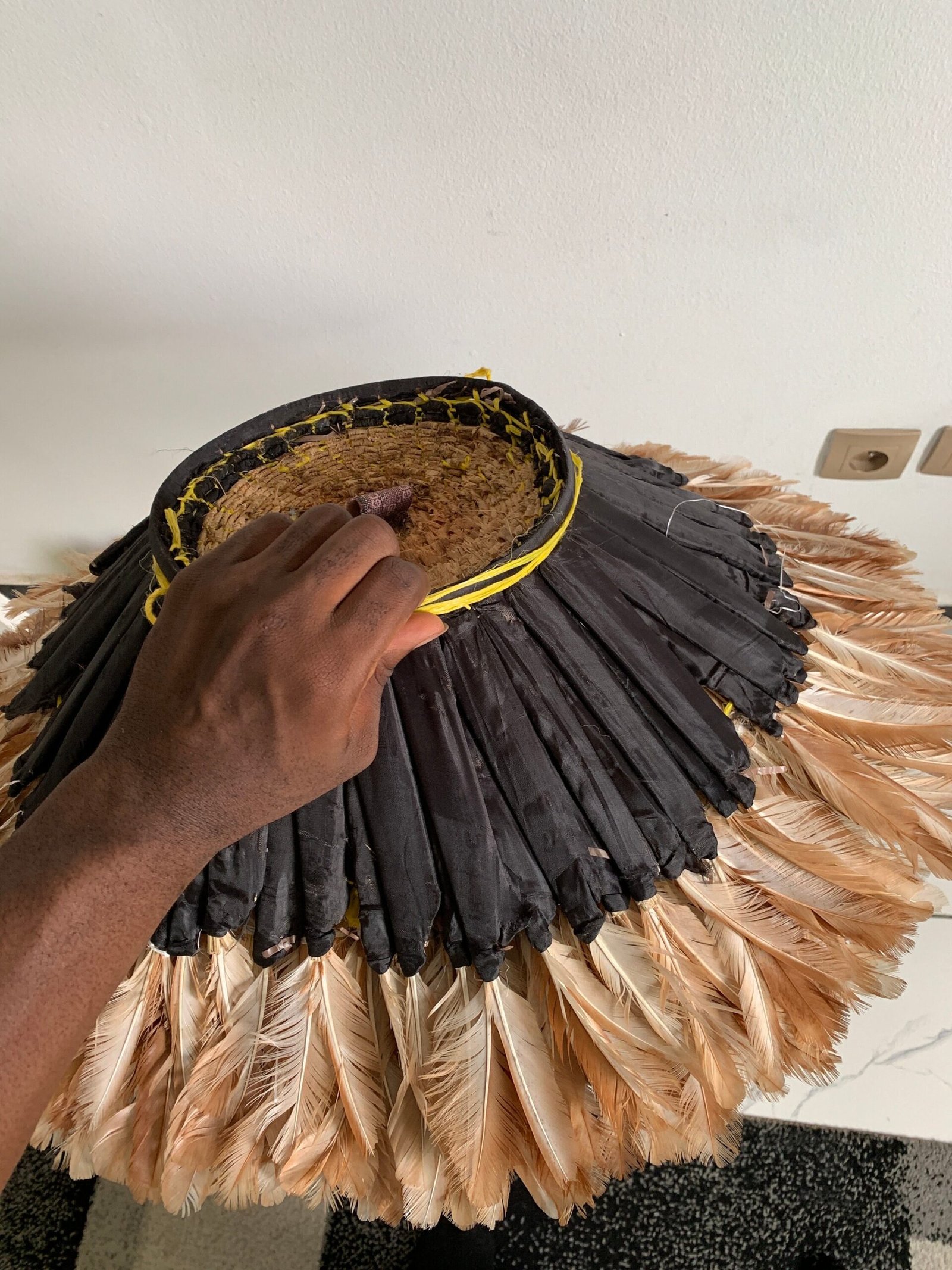 The headdresses are made of natural or dyed chicken feathers as well as various wild bird feathers. The feathers are stitched onto a woven raffia support that can be folded or unfolded.