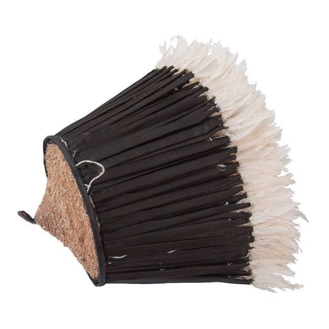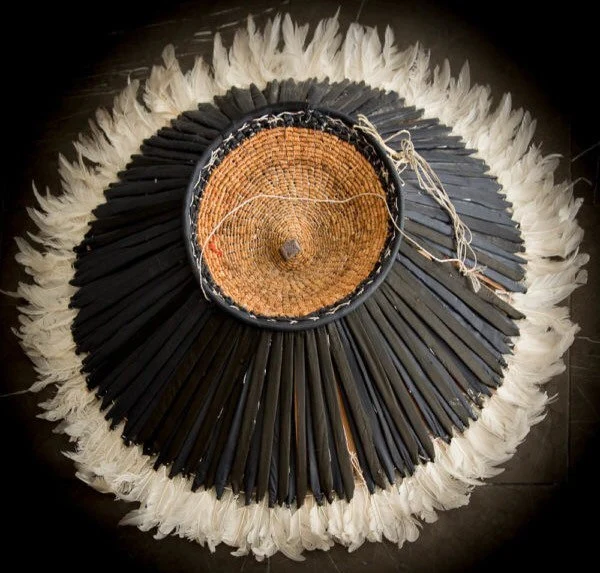 The headdresses are made of natural or dyed chicken feathers as well as various wild bird feathers. The feathers are stitched onto a woven raffia support that can be folded or unfolded.