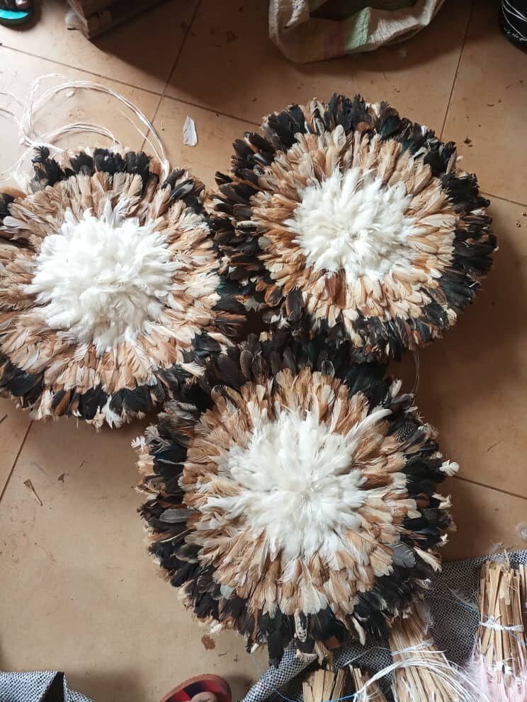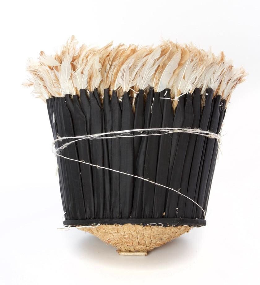 The headdresses are made of natural or dyed chicken feathers as well as various wild bird feathers. The feathers are stitched onto a woven raffia support that can be folded or unfolded.