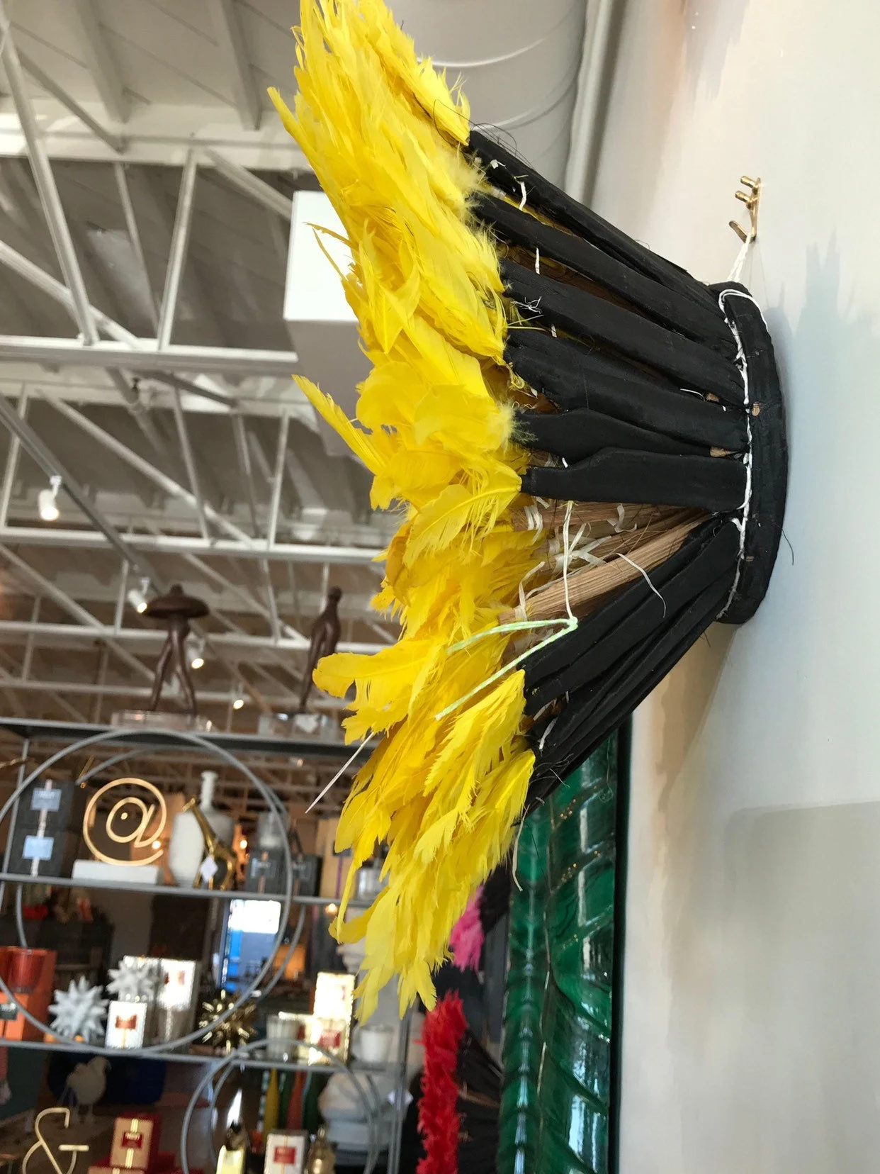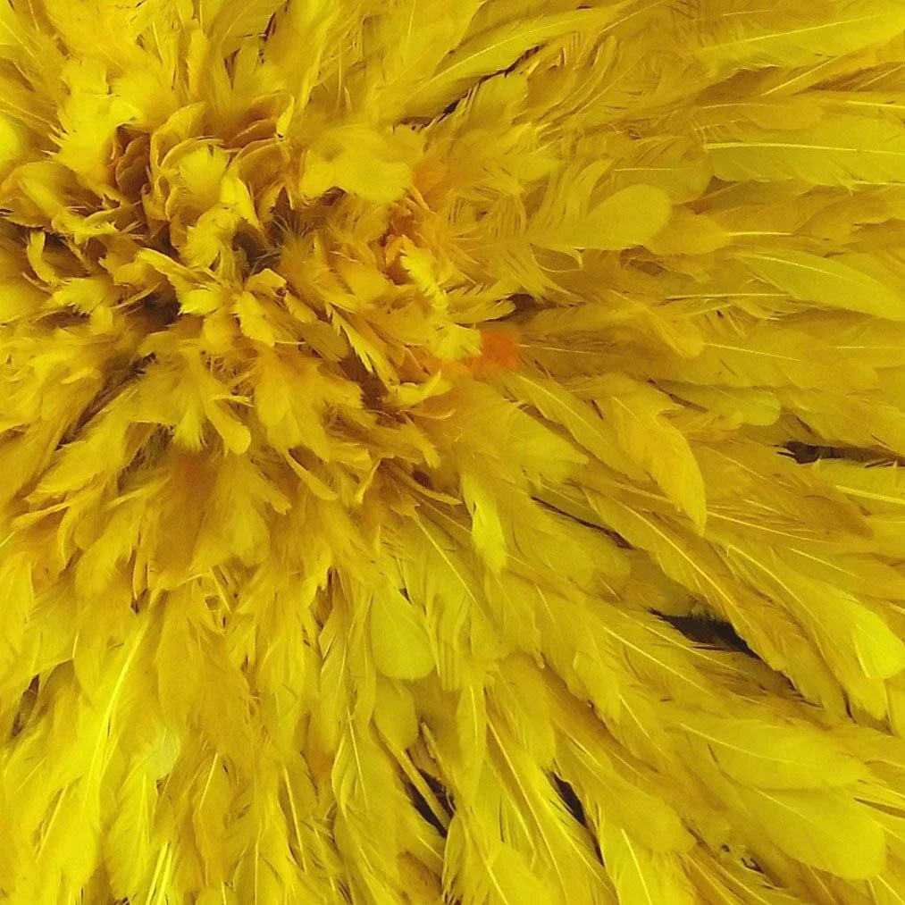 The headdresses are made of natural or dyed chicken feathers as well as various wild bird feathers. The feathers are stitched onto a woven raffia support that can be folded or unfolded.